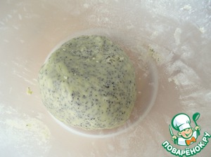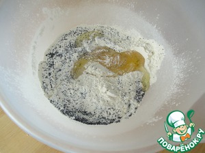 Муку (300 гр) просеять вместе с разрыхрытелем (1 ч. л.) в миску, добавить 30 гр мака и 50 гр меда. Смешать.