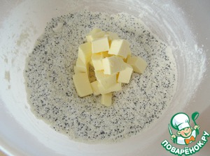 Добавить 125 гр холодного сливочного масла, нарезанного кубиками. Все перетереть между пальцами в крошку.