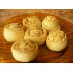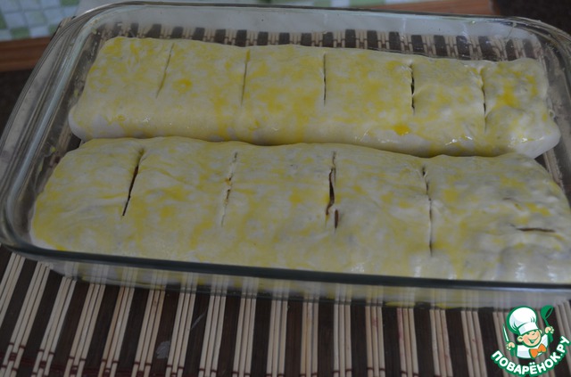 Выкладываем рулеты на противень (можно использовать бумагу, я выложила просто в форму, смазанную маслом).