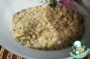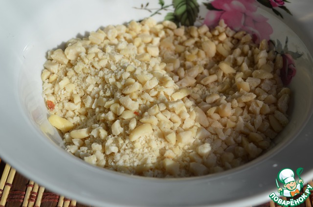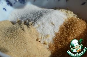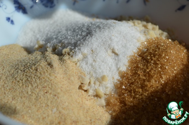 В отдельной миске смешиваем орехи, сахар (обычный и коричневый) и сухари.