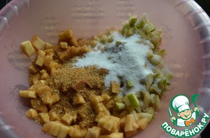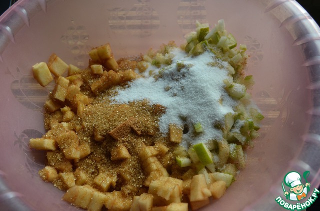 Выкладываем в миску и смешиваем с корицей, коричневым и обычным сахаром, мукой