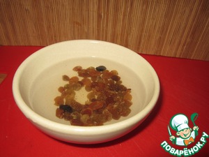 Изюм тщательно промоем и зальем кипятком, оставим постоять минут 20.
