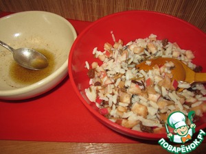 Затем вольем заправку в рисово-фруктовую смесь и тщательно перемешаем.