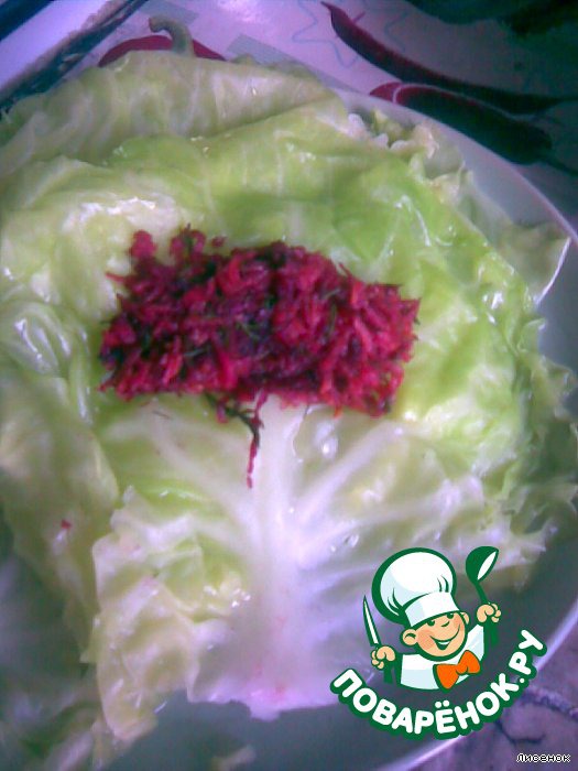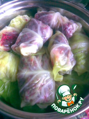 В капустный лист завернуть немного "фарша", как голубец и укладывать в кастрюлю.