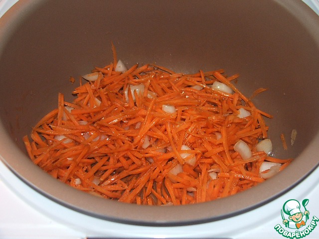В мультиварку наливаем масло, засыпаем лук, морковь и жарим минут 10, иногда помешивая.