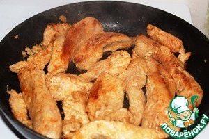 В разогретой сковороде на оливковом масле обжарить с двух сторон кусочки индейки, приблизительно по 5-7 минут на каждой стороне.
