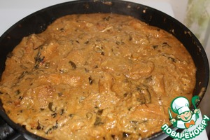 Добавить в сковороду с индейкой орехово-майонезную массу, тушить, помешивая, пока соус не загустеет. Это примерно 10 минут.
