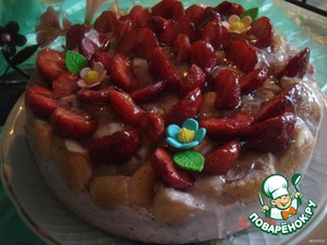 Достаем наш застывший шедевр и украшаем оставшейся клубничкой разрезая её на пополам и выкладывая сверху между печеньками. Желе для торта готовим по инструкции и поливаем сверху наш десерт.