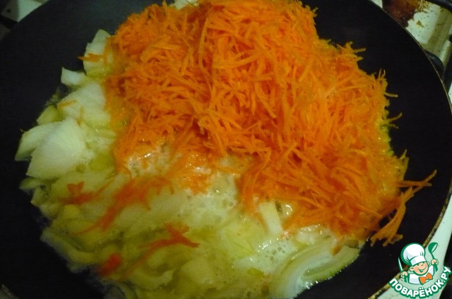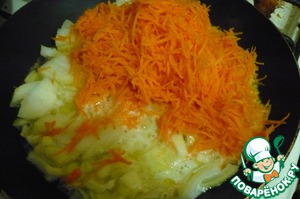 На сковороду налить растительное масло, положить сливочное масло и подогреть. Кладем шинкованный лук и тертую морковь. Обжариваем до готовности.