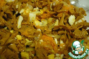 Яйца и грибы нарежем, добавим лук и морковь, чеснок. Перемешать.