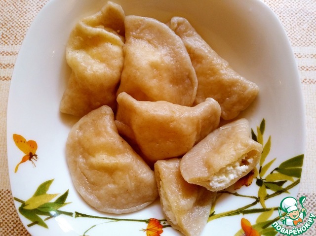 Обратите внимание на то, что тесто раскатано так тонко, что сквозь него просвечивается начинка. Такие варенички очень вкусны со сметаной. Ну, а сыро-брынзоманы от этого рецепта останутся в восторге.