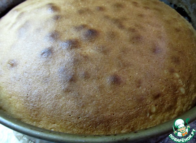 Корж готов, вынимаем его из формы, слегка остужаем и, перевернув вверх дном, снова укладываем в форму (а можно и не переворачивать :)