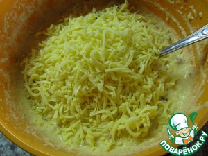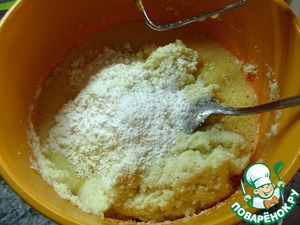 Яично-масляную массу, муку и разрыхлитель добавляем к набухшей манке,