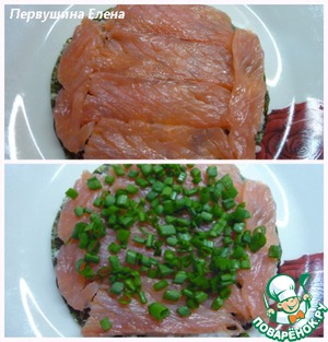 На рис, не жалея выкладываем ломтики красной рыбы, а на рыбку нарезанный зеленый лук.