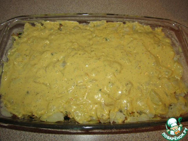 Заливаем соусом запеканку и ставим в разогретую до 180 градусов духовку на 15-20 минут.
