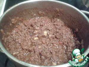 Добавляем в фарш мускатный орех 3 ч. л., душистый перец 3 ч. л., черный перец немного, соль немного, 4 ст. л. оливкового масла и томатную пасту. Ставим на огонь и провариваем, помешивая, до выпаривания лишней жидкости