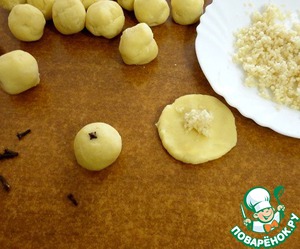 Чтобы распределить начинку равномерно, тесто разделить на 20 частей размером с грецкий орех и каждую раскатать в круг. В серединку круга укладываем по полчайной ложки начинки.