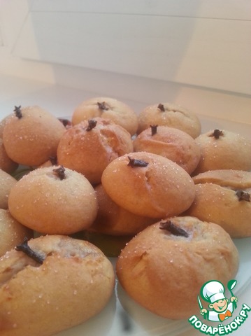 Приподнять тесто с двух сторон, скрепить края. Придать огруглую форму, в серединку вставить гвоздику, с другой стороны кусочек небольшой веточки, имитируя яблоко.