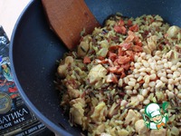 Когда рис с курицей дойдут до готовности и вся вода впитается, сделайте сильный огонь, добавьте сливочное масло, мед и орехи (у меня рубленый жареный миндаль и кедровые). Обжаривайте все вместе в течение 2-3 минут. |