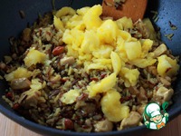 Красивые кусочки ананаса отложите для фруктового салата, остальные нарежьте и вместе с соком добавьте к рису. Мелко нарежьте перчик чили и смешайте с рисом. Снимите вок с огня. |