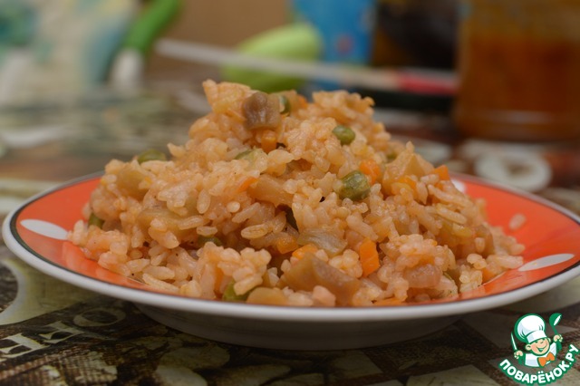 Отваренный до полуготовности рис выложить в сковороду поверх овощей. Если овощи суховатые, то добавить 2-3 столовые ложки кипяченой воды, если сочные, то просто укрыть крышкой и тушить еще 10-15 минут до готовности риса и овощей.