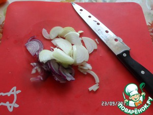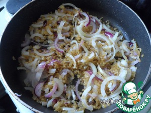 Лук репчатый и крымский нарезать полукольцами и обжарить на растительном масле 2-3 мин.