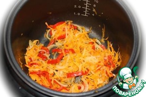 Лук и болгарский перец нарезать полукольцами, морковь натереть на крупной терке. Спассеровать овощи на растительном масле, добавить по вкусу соль.