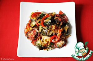 В контейнер или небольшую кастрюлю выкладываем слоями: пассерованные овощи, баклажаны, зелень с чесноком и т. д.
