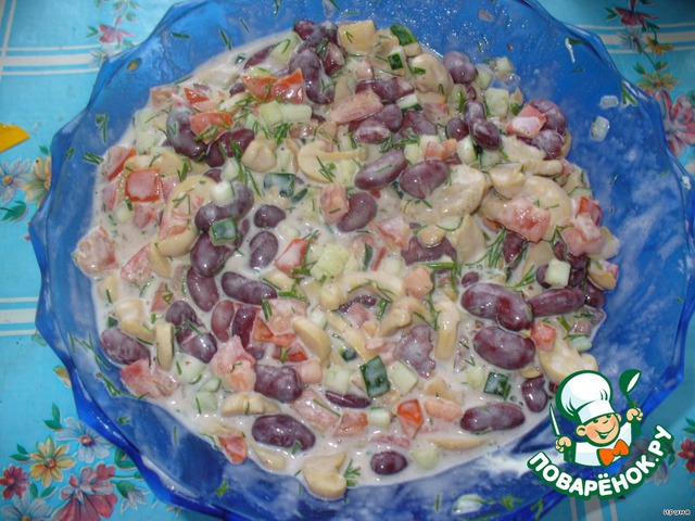 С фасоли и шампиньнов слить жидкость и добавить к овощам (шампиньоны должны быть пластинками, мельче не резать). Укроп мелко нарезать, добавить в салат. Всё хорошо перемешать, заправить майонезом, посолить и поперчить по вкусу.