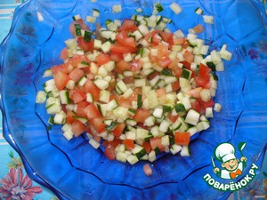 Огурцы и помидоры вымыть и нарезать очень мелкими кубиками. Сложить в салатник.