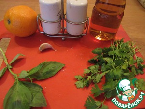Теперь займемся приготовлением заправки. Для этого мне понадобится 1 апельсин (сок ~ 50 мл), 2 ст. л. яблочного уксуса, зелень кинзы, 1 веточка базилика, 1 зуб. чеснока, соль и перец по вкусу.