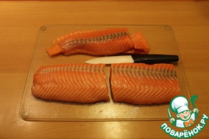 С филе лосося выбираем часть, где шире и толще, отрезаем и делим пополам.