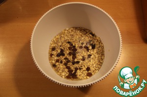 Хлопья с изюмом заливаем горячей водой (200 г) и накрываем крышкой (на 5 минут) -