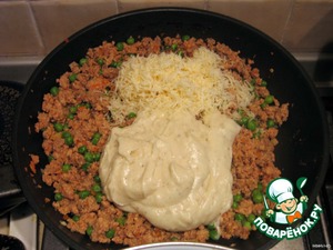 Добавить в фарш половину соуса и половину тертого сыра. Перемешать