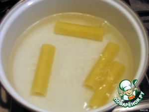 Поставить на огонь широкую кастрюлю, вскипятить в ней воду. Каннеллони (трубочки) бросать в кастрюльку, проварить 3-4 минуты, достать и сразу окунать в миску с холодной водой.