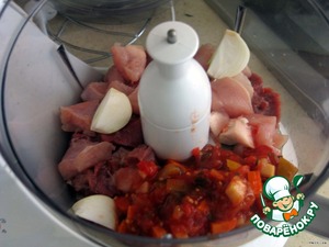 Лук, морковь, помидор, перец болгарский помыть и очистить. Мясо помыть, обсушить, нарезать кусочками. Зелень помыть. Все положить в комбайн и измельчить в фарш.