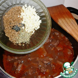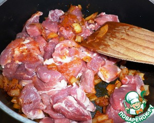 Добавить паприку и мясо, перемешать, продолжать обжаривать минут 15 (до тех пор, пока мясной сок выпарится почти весь)