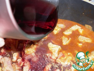 Влить вино, накрыть крышкой и тушить 50 минут на маленьком огне.