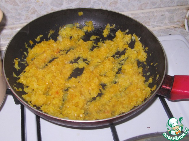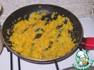 Очистить лук и перец. И мелко нарезать (я измельчила в блендере), после чего положить их в сковороду. Жарить 15 минут.