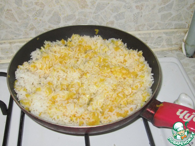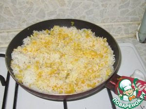Добавить в сковороду рис, который предварительно поварить минут 7 (до полуготовности). -