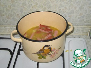 Рис с овощами переложить в кастрюлю с бульоном. Добавить сосиски. Варить 15 минут. -