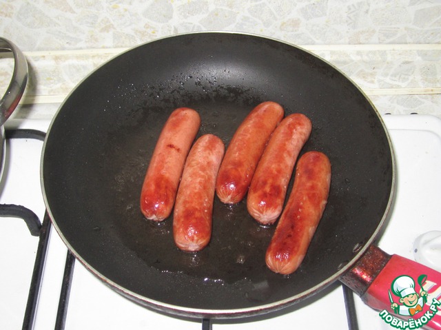 Сосиски проколоть вилкой в нескольких местах и обжарить со всех сторон на подсолнечном масле.