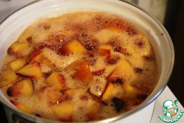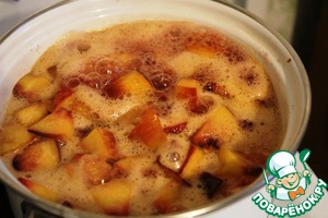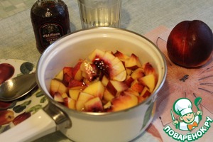 • В кастрюлю с кусочками нектаринов добавляю ром, полпорции меда (2 ст. л.) и полстакана воды. На огне довожу до кипения и варю, помешивая, 10 минут, снимаю с огня и даю остыть.