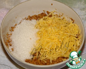 Добавляем натертый на мелкой терке сыр, сахар, перемешиваем.