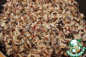 Рис отварить до готовности. Лук почистить, мелко нарезать и пассеровать на сливочном масле. Грибы измельчаем и добавляем к луку, помешивая; продолжаем приготовление до полной готовности грибов. Остывшие рис и грибы перемешиваем.