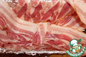 Форму для запекания выстелить фольгой. На фольгу выкладываем полоски бекона.