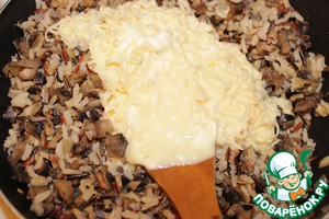 Сыр натереть на мелкой терке, добавить к взбитому яйцу и сливкам, все хорошо перемешать. Полученную смесь отправляем к рису с грибами и опять все перемешиваем.