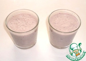 Остальные части бананов, которые побольше, очищаем, нарезаем на кусочки, складываем в блендер, добавляем черничное варенье или чернику, йогурт, апельсиновый сок.