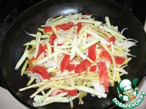 Теперь подготовим овощи. Баклажан и кабачок очищаем от кожуры и нарезаем тонкой соломкой. Помидор, лук - полукольцами. Все овощи выкладываем в хорошо разогретую сковородку с небольшим количеством оливкового масла. Обжариваем на большом огне минуты три. Добавить мелко порезанную петрушку, соль, перец.