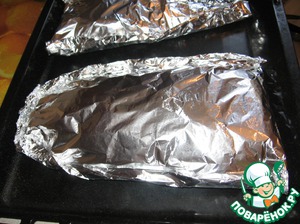 На фольгу выкладываем овощи вместе с соком, который они дали во время обжарки, а сверху рыбку.